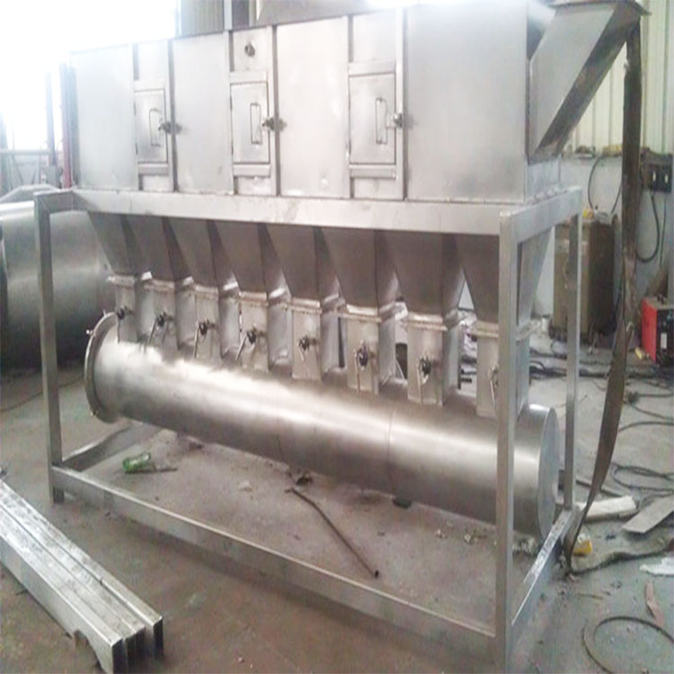 沸騰干燥,又稱流化床,它是由空氣過濾器、加熱器、沸騰床主機、旋風(fēng)分離器、布袋除塵器、高壓離心風(fēng)機、操作臺組成,由于干燥物料的性質(zhì)不同,配套除塵設(shè)備時,可按需要考慮,可同時選擇旋風(fēng)分離器、布袋除塵器,也可選擇其中一種,一般來說比重大的如沖劑及顆粒物料干燥只需選擇旋風(fēng)分離器,比重輕的小顆粒狀和粉狀物料需配套布袋除塵器,并備有氣力送料裝置及皮帶輸送機供選擇。