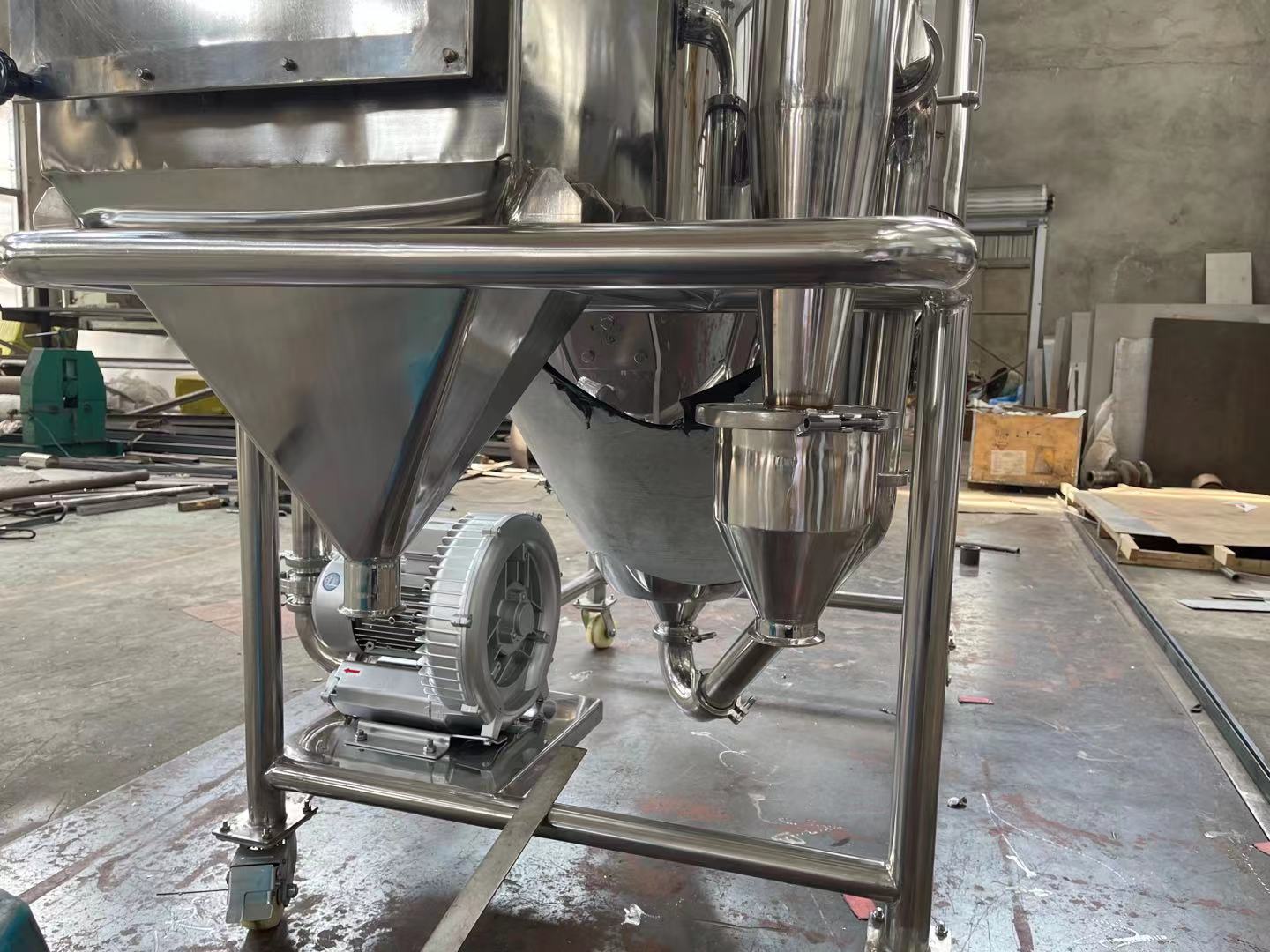 空氣經(jīng)空氣過濾器后進入空氣加熱器,當空氣加熱器到給定的溫度后以切線方向進入熱風分配器,經(jīng)熱風分配器作用后的空氣,均勻地、螺旋式地進入干燥室,同時料液由霧化器霧化為20~60um的霧滴,當霧滴與熱空氣接觸后就迅速汽化干燥為粉末或顆粒產(chǎn)品。采用旋風風離器直接收集后經(jīng)氣力輸送至料倉,完成物料的冷卻及輸送,廢氣由風機排出口經(jīng)水沫除塵器排出。