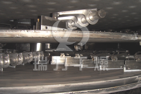 濕物料自加料器連續(xù)地加到干燥器上部第一層干燥盤上,帶有耙葉的耙臂作回轉(zhuǎn)運(yùn)動(dòng)使耙葉連續(xù)地翻抄物料。物料沿指數(shù)螺旋線流過(guò)干燥盤表面,在小干燥盤上的物料被移送到外緣,并在外緣落到下方的大干燥盤外緣,在大干盤上物料向里移動(dòng)并從中間落料口落入下一層小干燥盤中。大小干燥盤上下交替排列,物料得以連續(xù)地流過(guò)整個(gè)干燥器。中空的干燥盤內(nèi)通入加熱介質(zhì)(加熱介質(zhì)形式有飽和蒸汽、熱水和導(dǎo)熱油),加熱介質(zhì)由干燥盤的一端進(jìn)入,從另一端導(dǎo)出。已干物料從最后一層干燥盤落到殼體的底層,最后被耙葉移送到出料口排出。水份由設(shè)在頂蓋上的排濕口排出。并可通過(guò)配加翅片加熱器、溶劑回收冷凝器、袋式除塵器、干料返混機(jī)構(gòu)、引風(fēng)機(jī)等輔機(jī),可提高干燥機(jī)的生產(chǎn)能力和效果,也能進(jìn)行熱解和反應(yīng)操作。該設(shè)備集傳導(dǎo)干燥和攪拌輸送之長(zhǎng),結(jié)構(gòu)上采用薄板沖壓焊接的大小加熱盤和擺動(dòng)可調(diào)的回轉(zhuǎn)耙葉的巧妙組合,配以定量加料和無(wú)級(jí)調(diào)速;工藝上采用串并聯(lián)輸入加熱介質(zhì)和末期冷卻降溫等措施,料層薄,熱阻小,暴露表面大,加熱面積100%利用,充分發(fā)揮了傳導(dǎo)干燥熱能利用率高的優(yōu)點(diǎn)。實(shí)踐表明,該設(shè)備結(jié)構(gòu)新穎緊湊,生產(chǎn)密閉連續(xù),調(diào)解維修簡(jiǎn)便,操作穩(wěn)定可靠,具有彈性大、效率高、能耗省、干燥時(shí)間可控?! ?