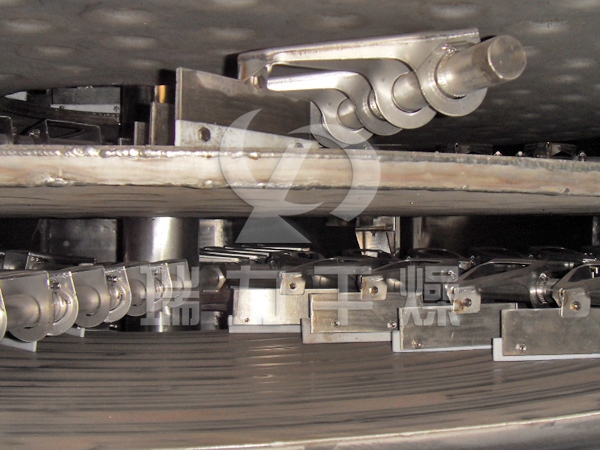 濕物料自加料器連續(xù)地加到干燥器上部第一層干燥盤上,帶有耙葉的耙臂作回轉(zhuǎn)運動使耙臂作回轉(zhuǎn)運動使耙葉連續(xù)地翻抄物料。物料沿指數(shù)螺旋線流過干燥盤表面,在小干燥盤上的物料被移送到外緣,并在外緣落到下方的大干燥盤外緣,在大干盤上物料向里移動并從中間落料口落如下一層小干燥盤中。大小干燥盤上下交替排列,物料得以連續(xù)地流過整個干燥器。中空的干燥盤內(nèi)通入加熱介質(zhì),加熱介質(zhì)形式有飽和蒸汽、熱水和導(dǎo)熱油,加熱介質(zhì)由干燥盤的一端進入,從另一端導(dǎo)出。已干物料從最后一層干燥盤落到殼體的底層,最后被耙葉移送到出料口排出。濕份從物料中逸出,由設(shè)在頂蓋上的排濕口排出,真空型盤式干燥器的濕氣由設(shè)在頂蓋上的真空泵口排出。從底層排出的干物料可直接包裝。通過配加翅片加熱器、溶劑回收冷凝器、袋式除塵器、干料返混機構(gòu)、引風(fēng)機等輔機,可提高其干燥的生產(chǎn)能力,干燥膏糊狀和熱敏性物 料,可方便地回收溶劑,并能進行熱解和反應(yīng)操作。