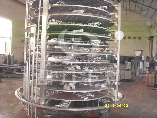 濕物料自加料器連續(xù)地加到干燥器上部第一層干燥盤上,帶有耙葉的耙臂作回轉(zhuǎn)運(yùn)動使耙臂作回轉(zhuǎn)運(yùn)動使耙葉連續(xù)地翻抄物料。物料沿指數(shù)螺旋線流過干燥盤表面,在小干燥盤上的物料被移送到外緣,并在外緣落到下方的大干燥盤外緣,在大干盤上物料向里移動并從中間落料口落如下一層小干燥盤中。大小干燥盤上下交替排列,物料得以連續(xù)地流過整個干燥器。中空的干燥盤內(nèi)通入加熱介質(zhì),加熱介質(zhì)形式有飽和蒸汽、熱水、導(dǎo)熱油和高溫熔鹽,加熱介質(zhì)由干燥盤的一端進(jìn)入,從另一端導(dǎo)出。已干物料從最后一層干燥盤落到殼體的底層,最后被耙葉移送到出料口排出。濕份從物料中溢出,由設(shè)在頂蓋上的排濕口排出,真空型盤式干燥器的濕氣由設(shè)在頂蓋上的真空泵口排出。從底層排出的干物料可直接包裝。通過配加翅片加熱器、溶劑回收冷凝器、袋式除塵器、干料返混機(jī)構(gòu)、引風(fēng)機(jī)等輔機(jī),可提高其干燥的生產(chǎn)能力,干燥膏糊狀和熱敏性物料,可方便地回收溶劑,并能進(jìn)行熱解和反應(yīng)操作。