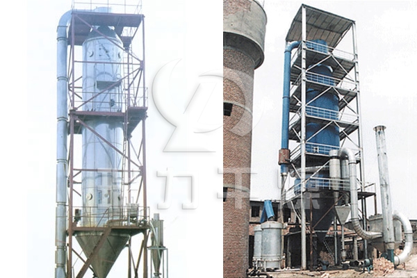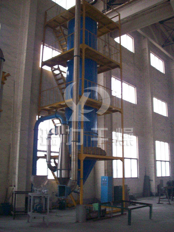 工作時物料液通過隔膜泵高壓輸入,噴出霧狀液滴,然后同熱空氣并流下降,大部分粉粒由塔底排料口收集,廢氣及其微小粉末經(jīng)旋風(fēng)分離器分離,廢氣由抽風(fēng)機(jī)排出,粉末由設(shè)在旋風(fēng)分離器下端的授粉筒收集,風(fēng)機(jī)出口還可裝備二級除塵裝置,回收率在96-98%以上。